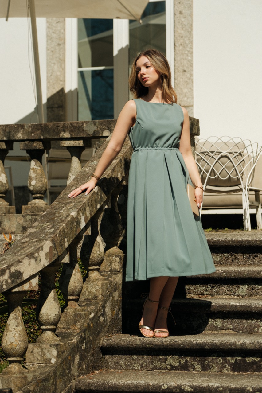 Vestido midi com decote redondo e manga cava. Folho inferior com elástico e pregas macho. Fecho de correr invisível na parte de trás.